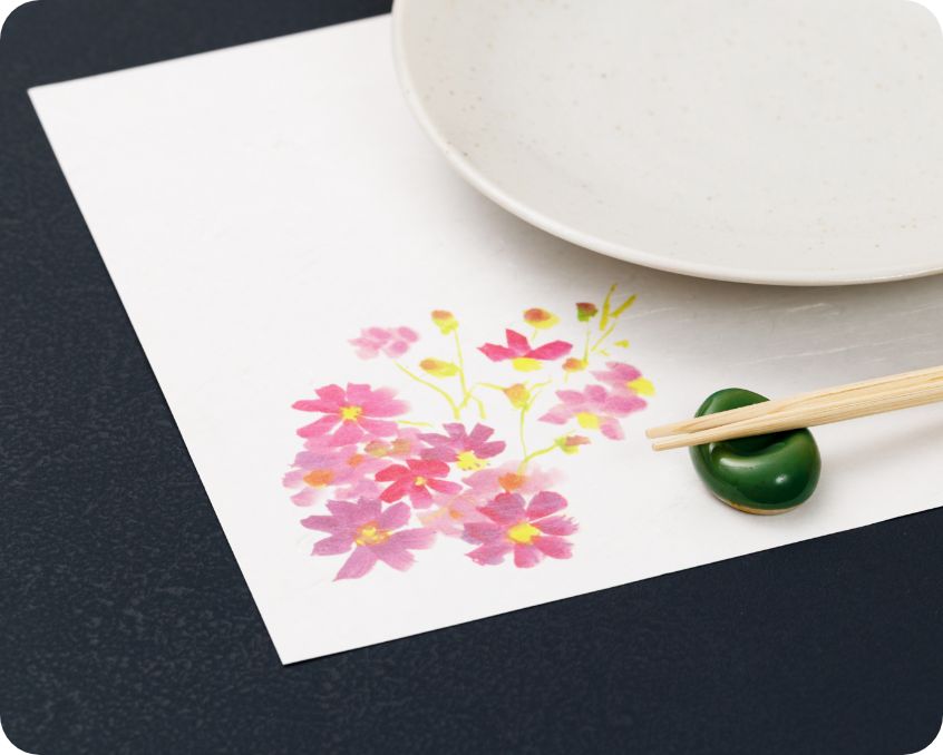 お客さまを迎える“おもてなし”の一部として、食事のひとときを上品に彩るテーブルマット「彩宴」シリーズを中心に展開。紙処・四国中央市で生まれた上質な和紙を使用し、その風合いが高級感を引き立てます。日本画作家とともに丁寧に作り上げたオリジナルの絵柄は、作品のような趣きを持つ一枚に。割烹・旅館をはじめ、多くの飲食店で長く愛されている理由は、その確かな品質と存在感にあります。